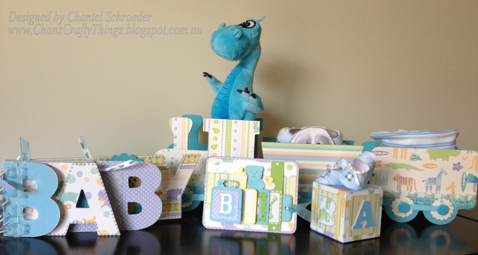 The baby word album and train set are both from Kaisercraft and I decorated them with papers from the DCWV Nana's Nursery, Baby Boy stack (such a pretty stack and perfect for any baby boy project). My husband picked out the dinosaur to "drive" the train, and we added a few goodies in the carriages.