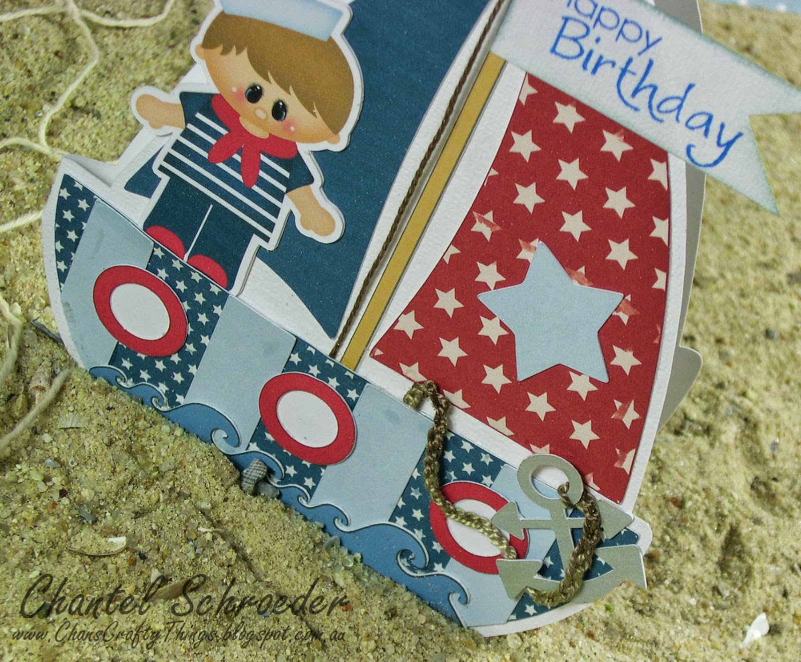 I added some embroidery thread for the ropes and hand knitted a piece for the "anchor chain". Finally, I hand cut the flag and stamped the happy birthday with Stazon ink before I adhered it to the card.