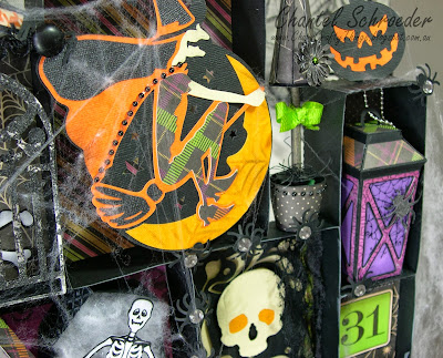Once I was done decorating each of the eleven boxes separately, I shuffled them around until I thought the order looked right and then I glued them together. I then proceeded to cut out a whole bunch of other elements such as spiders, spiderwebs, pumpkins and Jack o' Lanterns from various kits and collections and glued them all over the Shadow Box. I also made a miniature version of the banner from the Midnight Jamboree Kit. It really ties everything together so nicely.