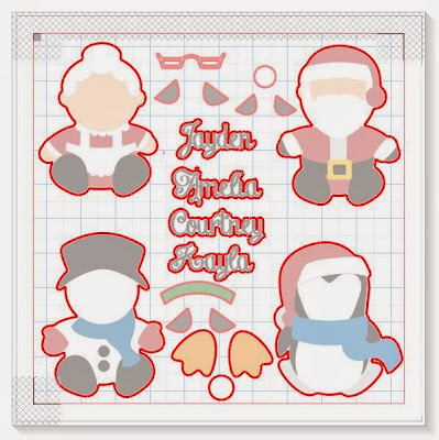 To make them, I used the print and cut feature on my Cameo with the Silhouette Designer software. I was able to cut all the cuties and the names out of one sheet of white cardstock - Awesome! Here are some screenshots.