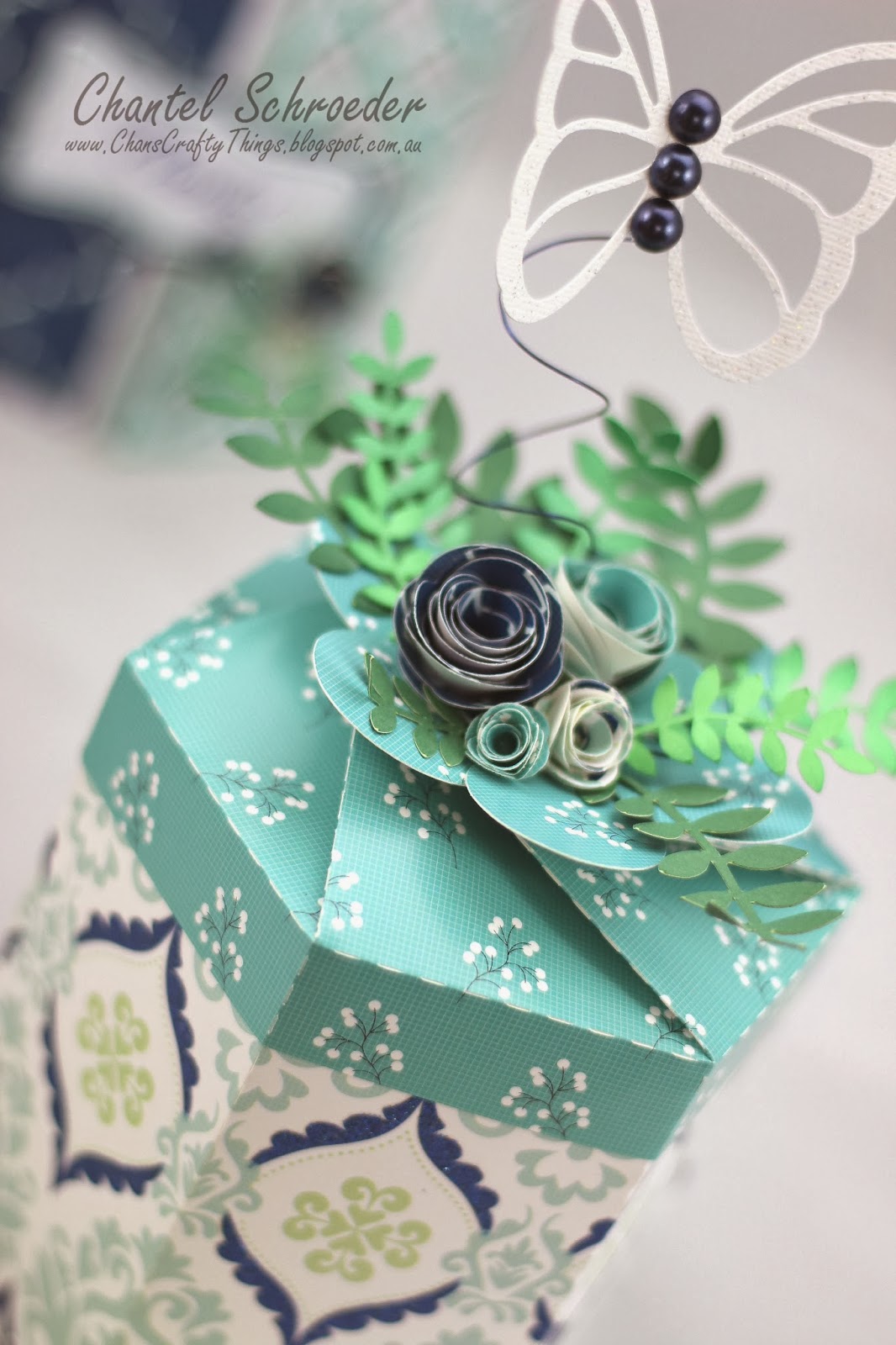 Now for the other details... I used the Blossom Box file from the Gift Boxes SVG Kit and embellished it with some rolled roses and greenery from the Mothers Garden SVG kit. The butterfly is from the High Skies SVG kit (without the vellum) and the navy pearls are from Kaisercraft.
