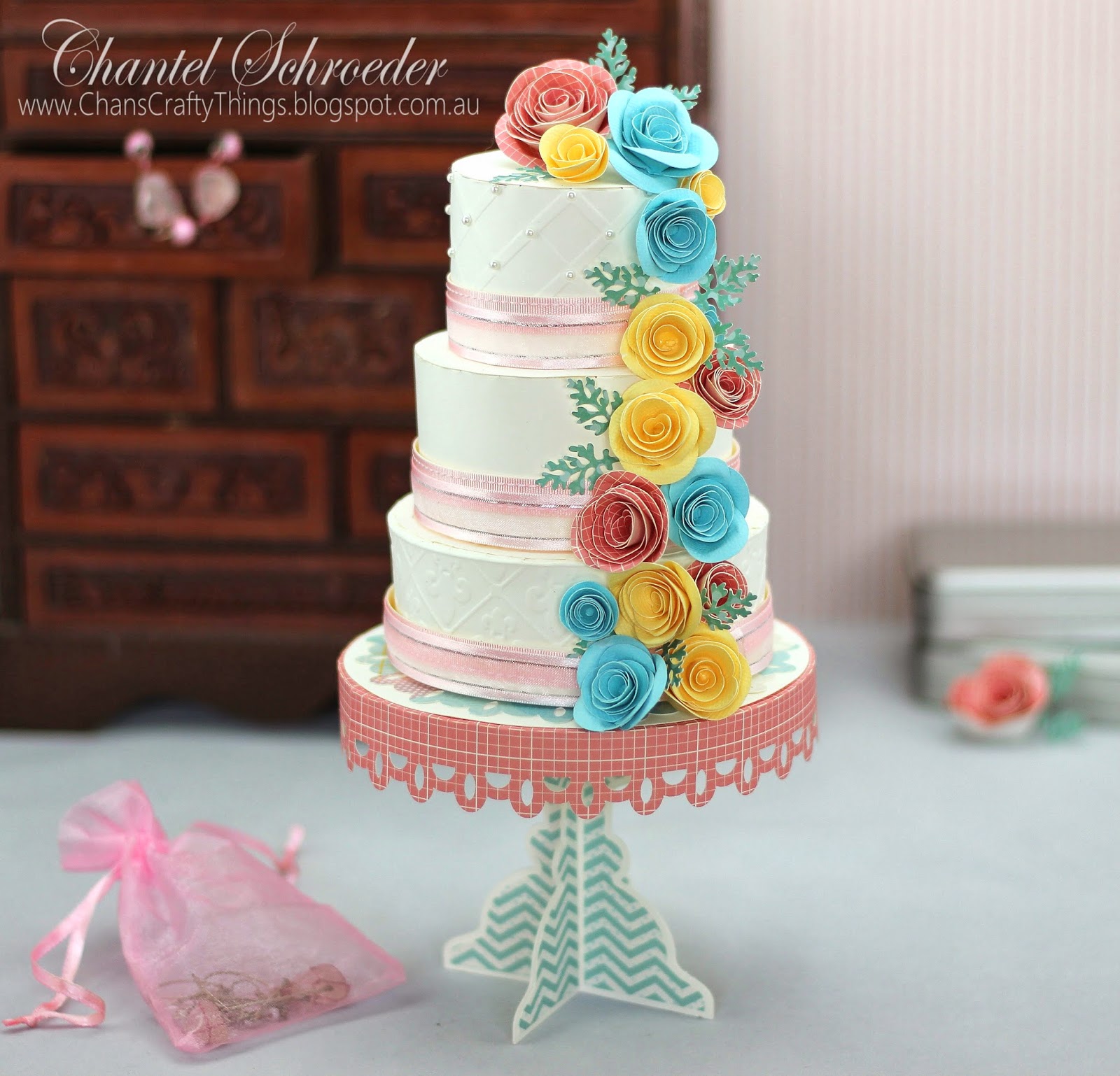 For the stand, I used the pedestal file from the Happy Birthday to You SVG kit. The round box files that form the cake is from the Poplar Street Tulips SVG kit. I sized them down quite a bit so that the cake would fit on the stand.