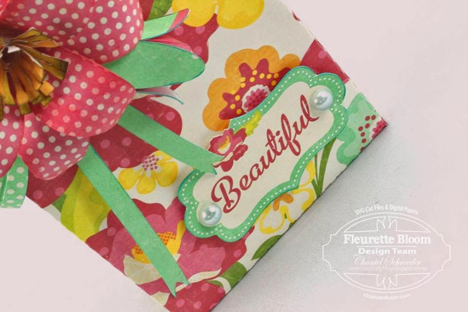 The gift bag cutting file is from the New "Peacock Palace" 3D SVG Kit - with Printables from Fleurette Bloom. Such a fun bag to work with and I just love the Tiger Lilly embellishment. I wanted the bag to be a bit playful so decided to go with patterned paper for the lilly and leaves - rather than trying to make the flower look more realistic.