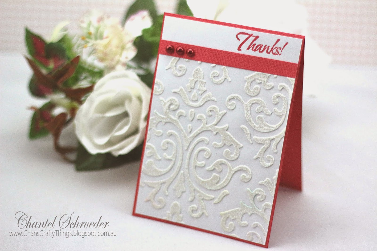 I used the 12' x 12' Damask stencil by Kaisercraft and placed it over a piece of plain white cardstock. First I applied texture paste over the stencil and then carefully removed the stencil whilst the paste was still wet. Then I covered the wet paste with Stampendous Kaleidoscope embossing powder and set it aside to dry for a few hours. Once dry, I heat set the embossing powder with my heating tool.