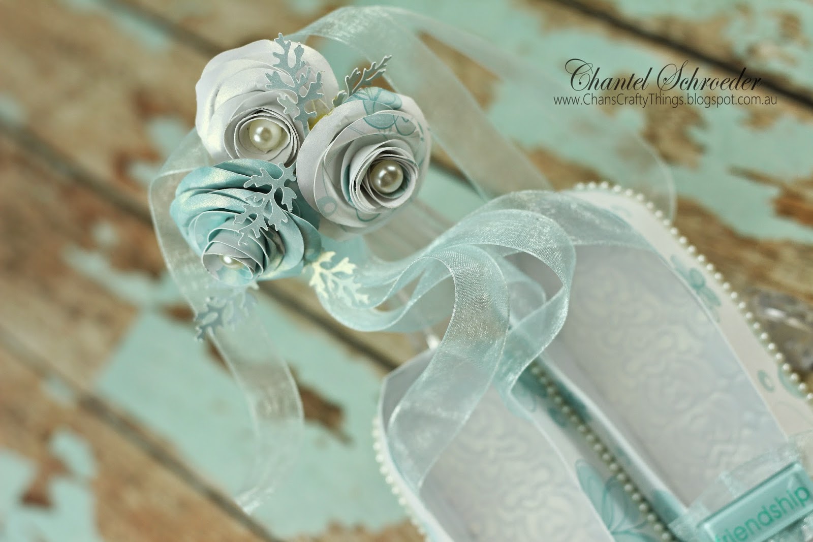 The roses are from the Crush On You Boxes SVG Kit - I just added a little Kaisercraft pearl in each one to tie in with the string pearls around the slippers. I also ran the inner soles through my Bigshot to create a bit of interest.