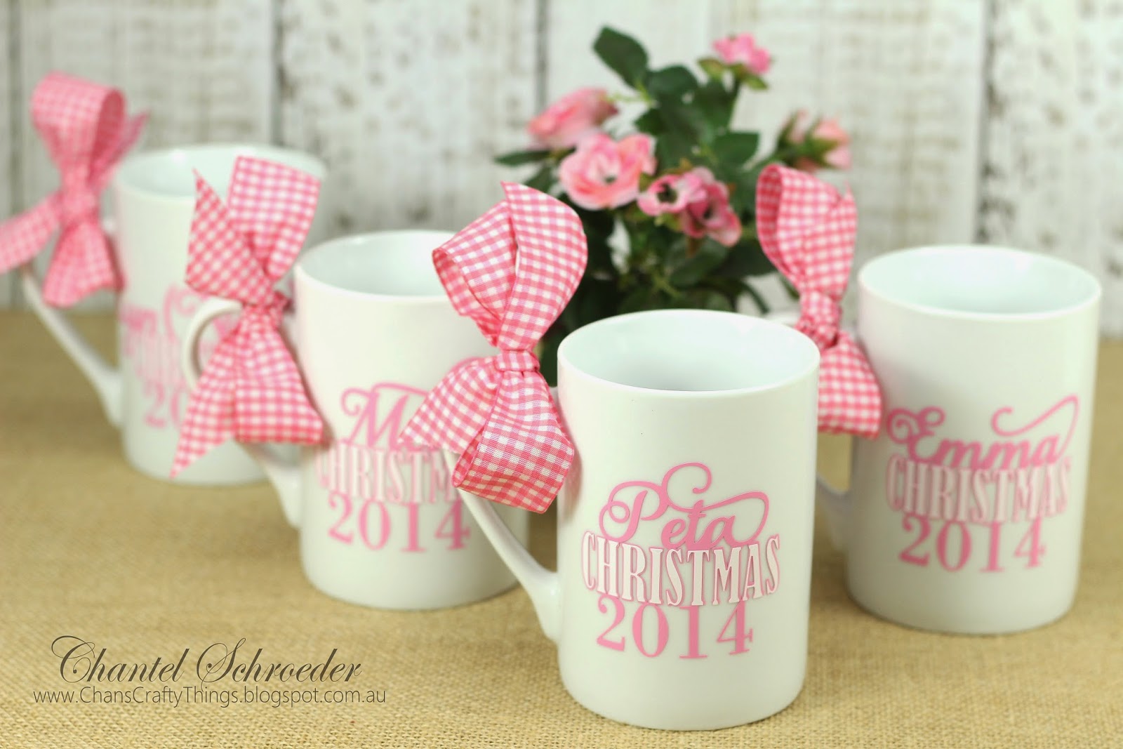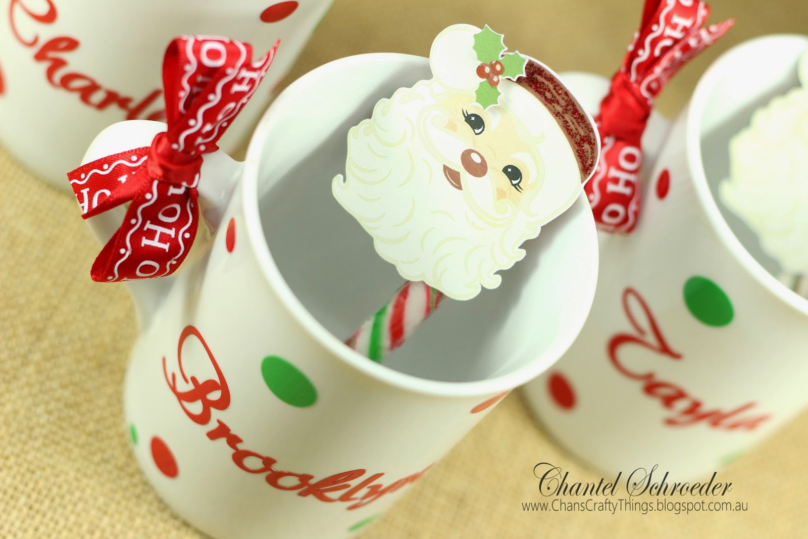 Finally I added some cute candy canes to each mug. The santa was a freebie file from Miss Kate Cuttables and I simply did a print and cut and then added a touch of glitter before adhering these cuties to some candy canes.