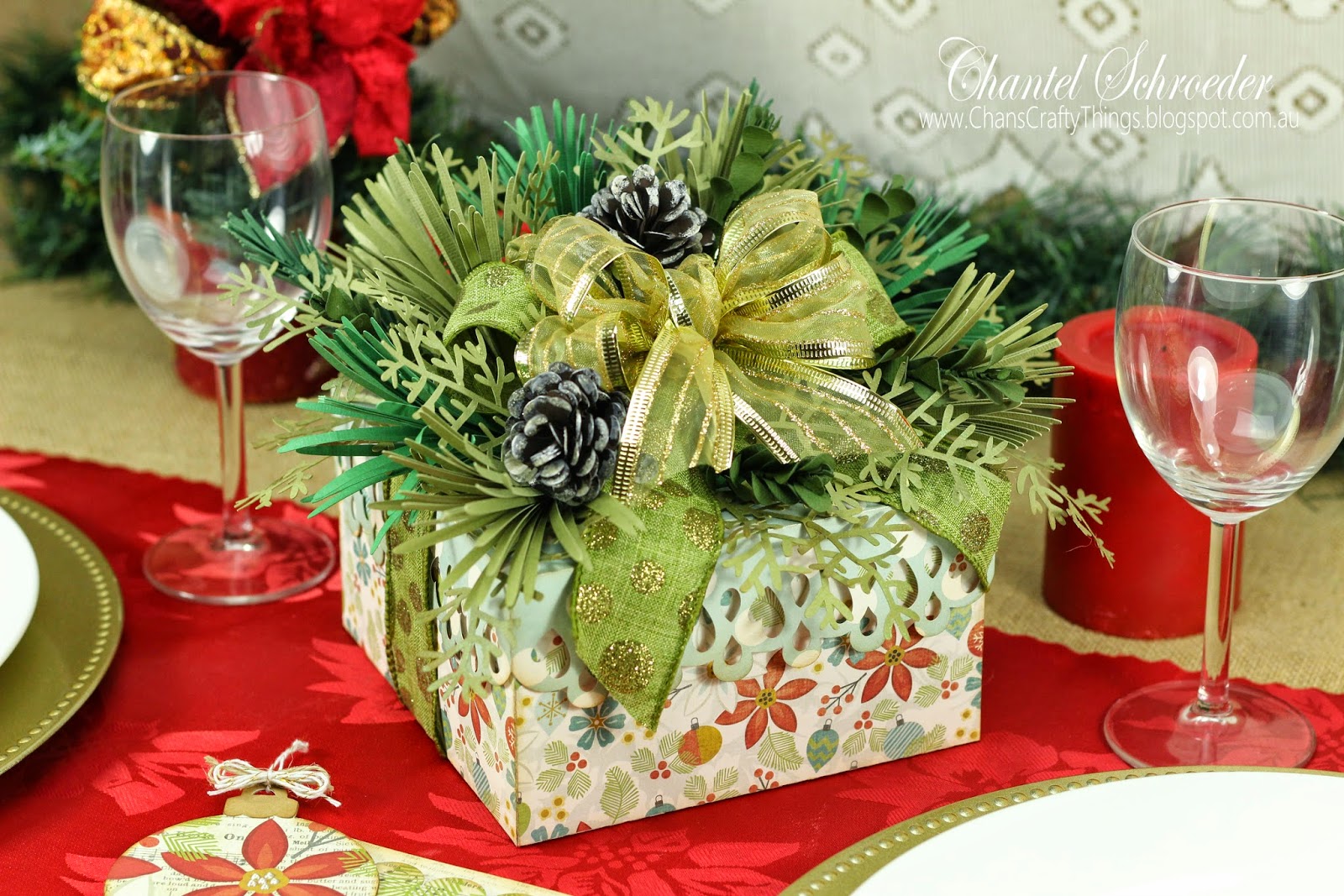I started with a basic box (from the Christmas Gift Bags and Boxes SVG Kit) and tied a big bow around it. I then arranged a whole bunch of pinecones and wintergreens from the 3D Wintergreens SVG Kit on top. For measurements and full details on how I made it, feel free to pop over to the SVGCuts blog and read my post.